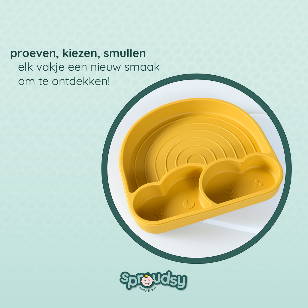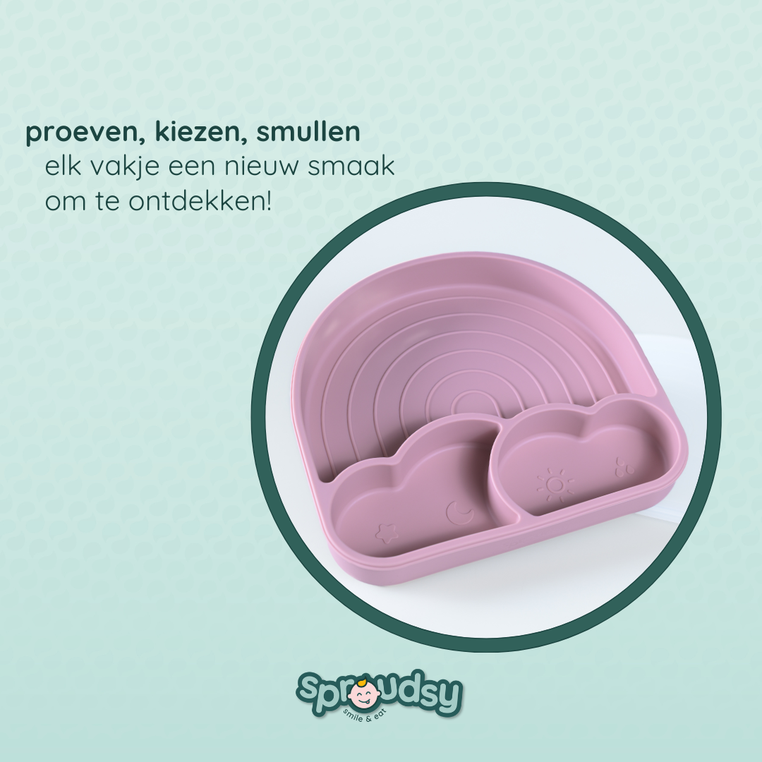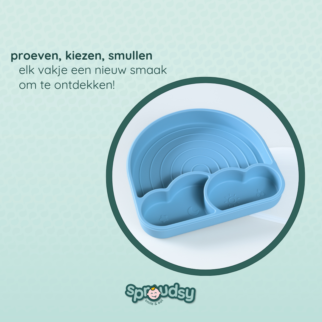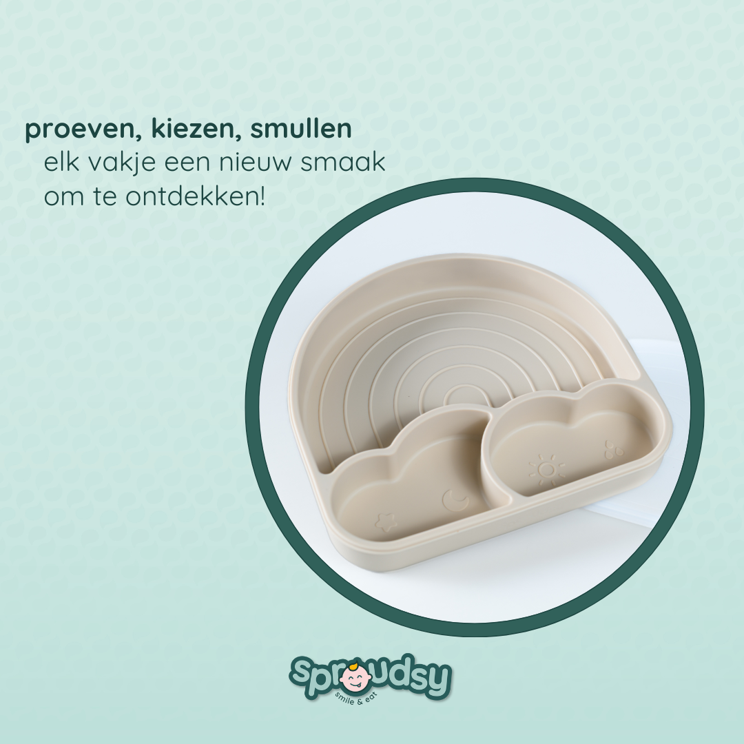 Stap binnen in een wereld vol zonnetjes, wolkjes en eindeloze verbeelding – dat is de magie van onze Clouds-lijn. Het regenboog-bordje met deksel houdt hapjes gescheiden én vers, terwijl het luchtige bestek perfect past in kleine handjes.