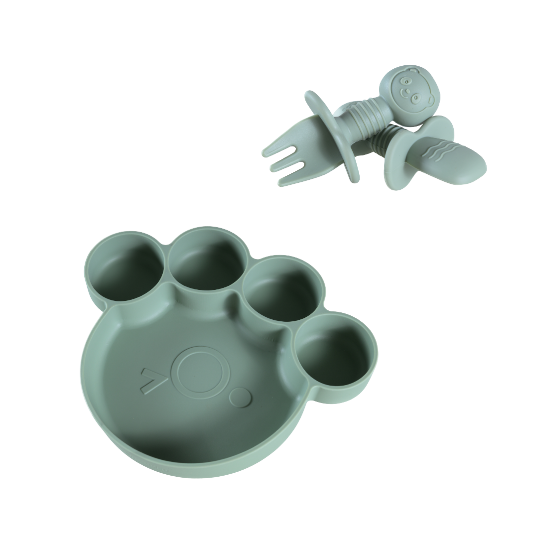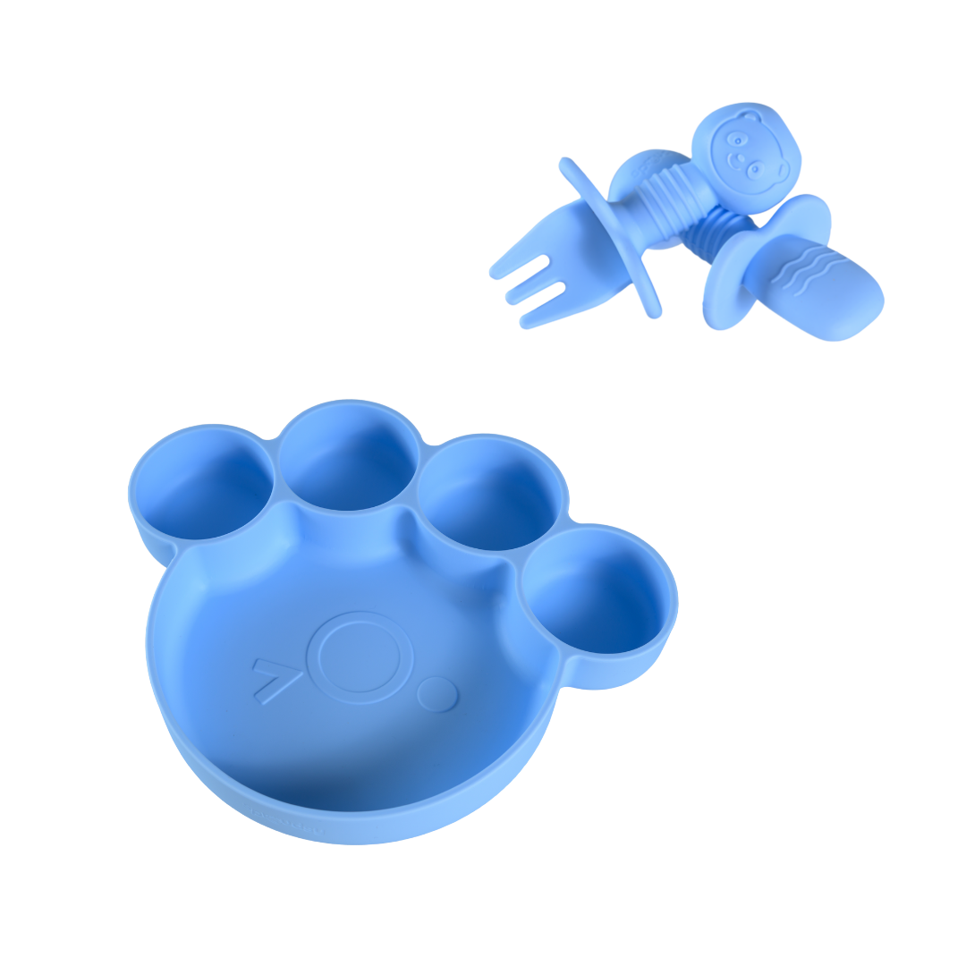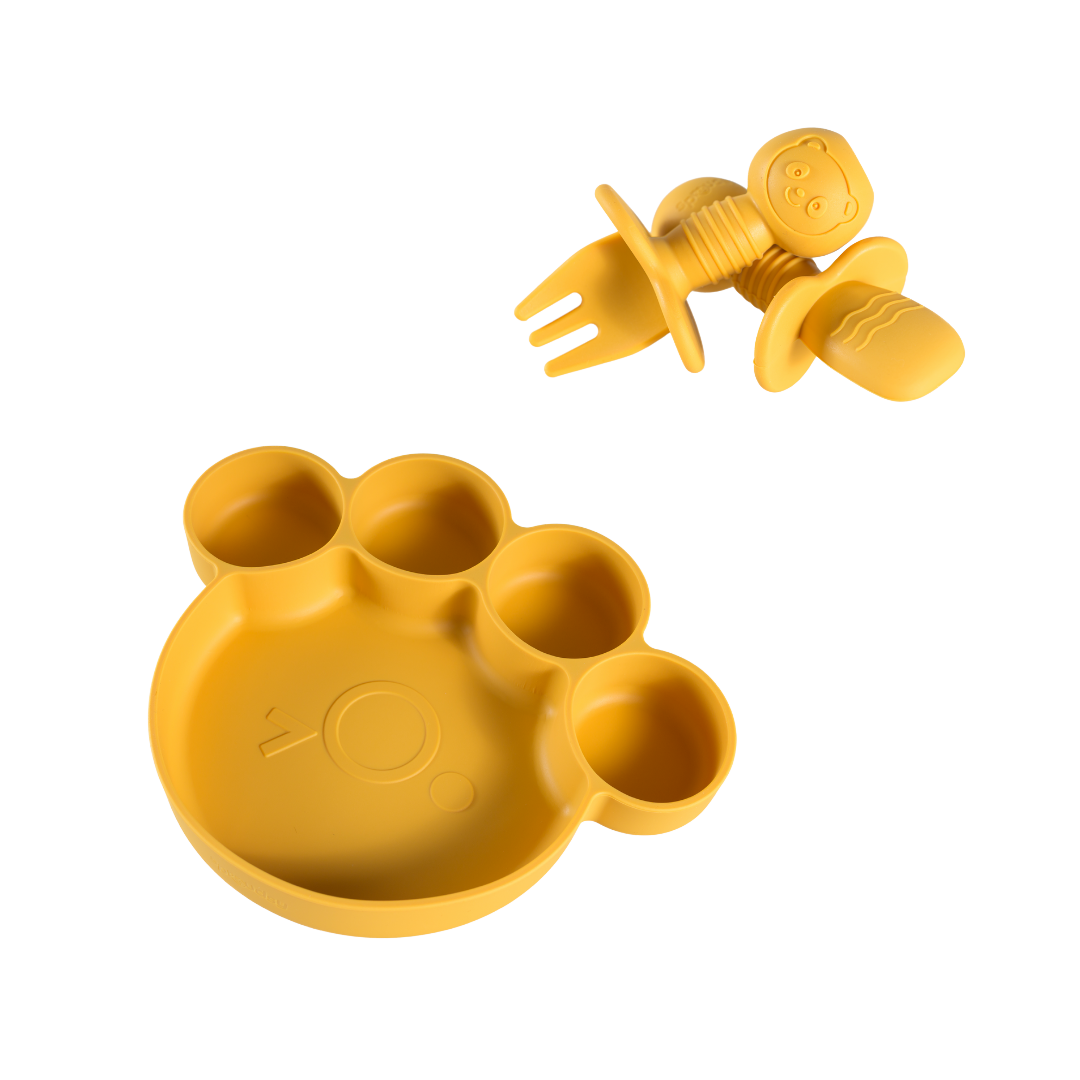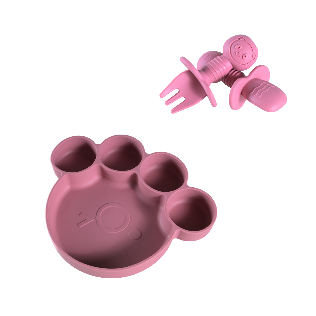 Van de eerste hapjes tot echte berenhonger: met onze Teddy Bear-lijn wordt elke maaltijd een knus avontuur. Het bord in pootjesvorm, het kommetje met oortjes en het bestek met schattige berengezichtjes maken eten leuk én herkenbaar.